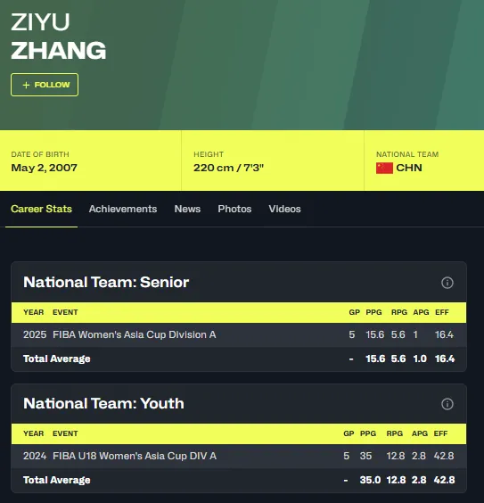 2024年女篮U18亚洲杯,张子宇5场比赛,场均35分12.8篮板2.8助攻。